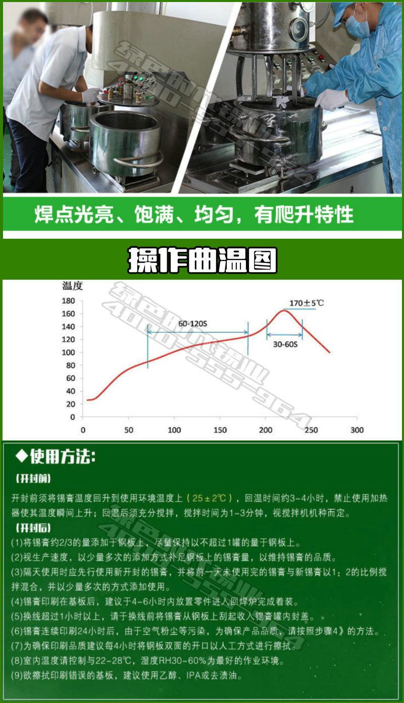 (0.4mm)的貼裝。溶劑揮發慢,可長時間印刷而不會影響錫膏的印刷粘度。